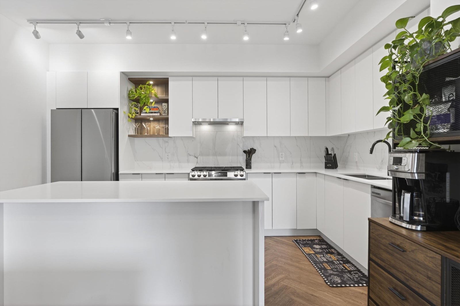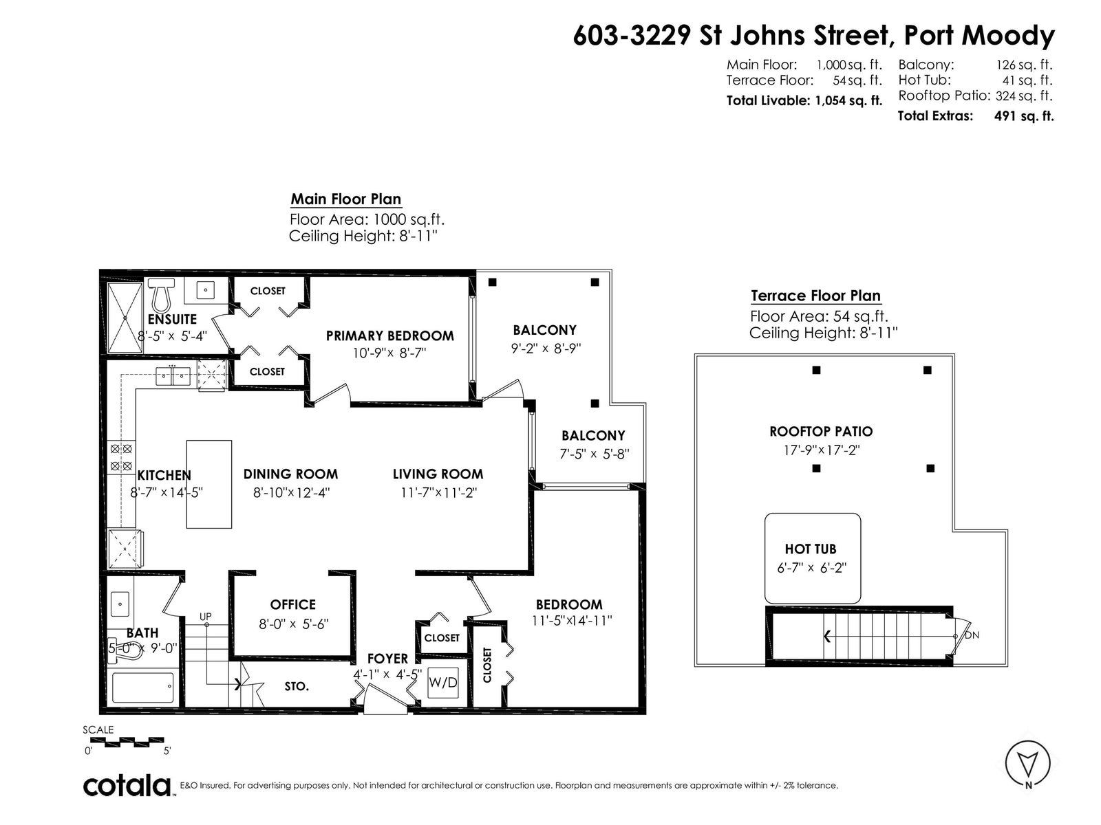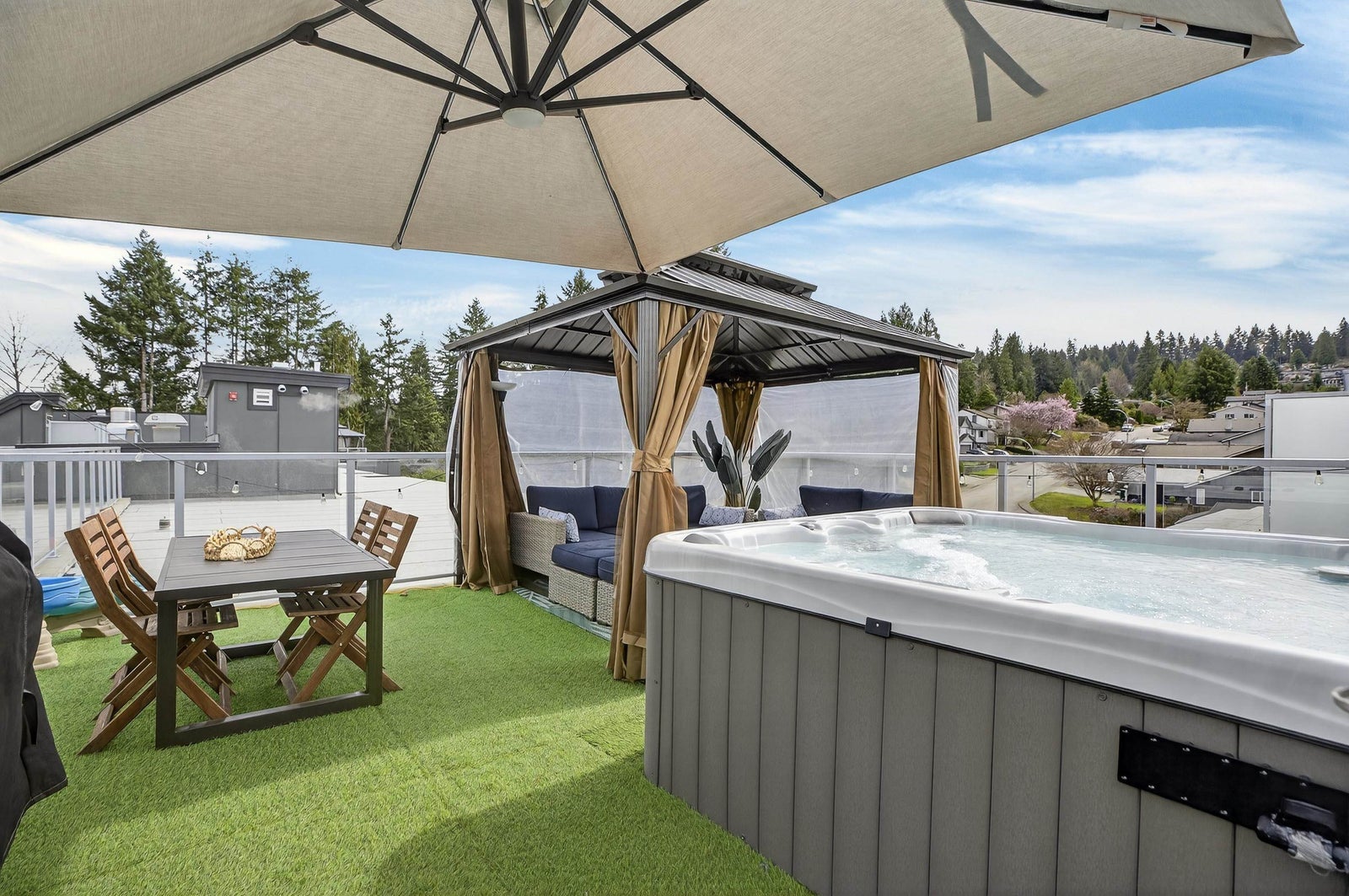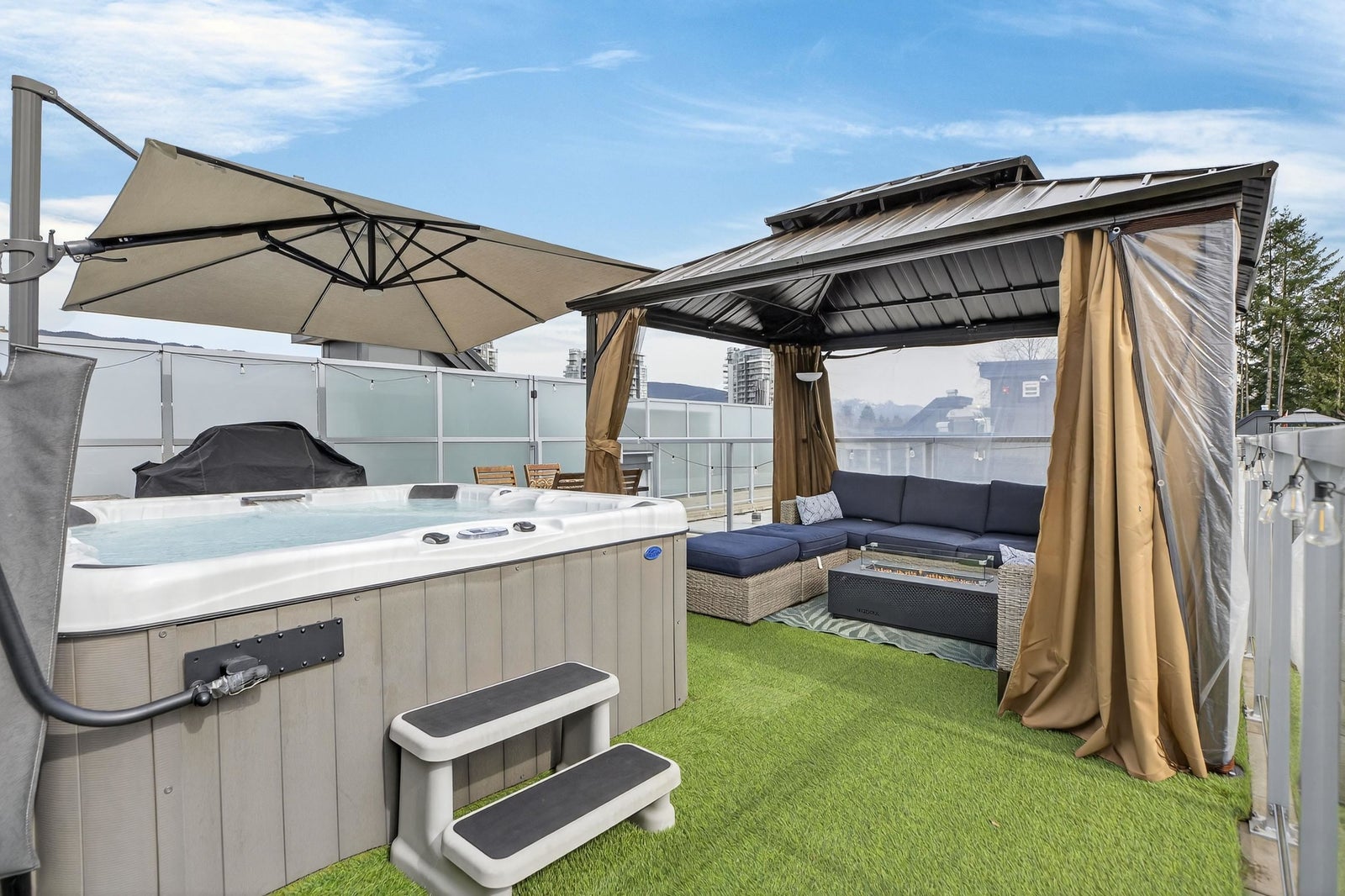 Welcome to THE CLYDE in the vibrant heart of Port Moody! This stunning penthouse has 2 bedrooms + den + 2 bathrooms, highlighted by an expansive private rooftop patio complete with a hot tub & metal gazebo—perfect for relaxing or entertaining. Offering 1,054 sq ft of open-concept living, the home showcases a sleek white kitchen with quartz countertops, a large island, S/S appliances, & vinyl herringbone flooring throughout. The spacious primary bedroom includes custom built-in cabinets & a private ensuite, while the second bedroom is bright & generously sized with plenty of natural light. Bonus features include 2 side-by-side EV-ready parking stalls, 1 storage locker & 2 pets allowed. Ideally located just steps from Inlet Skytrain & everything Port Moody offers.