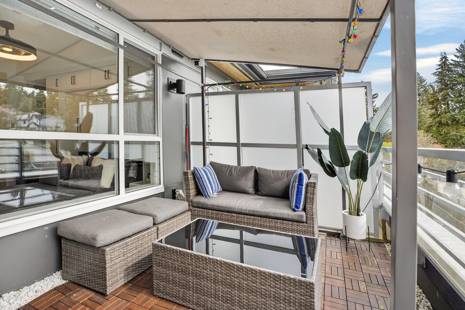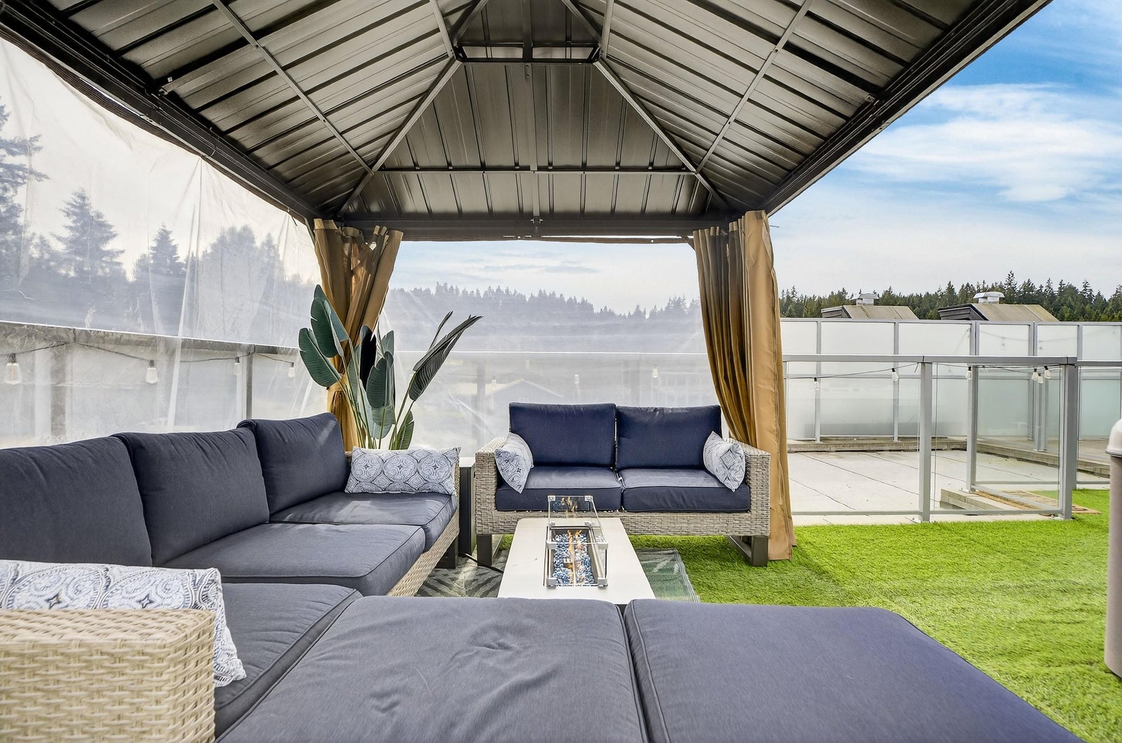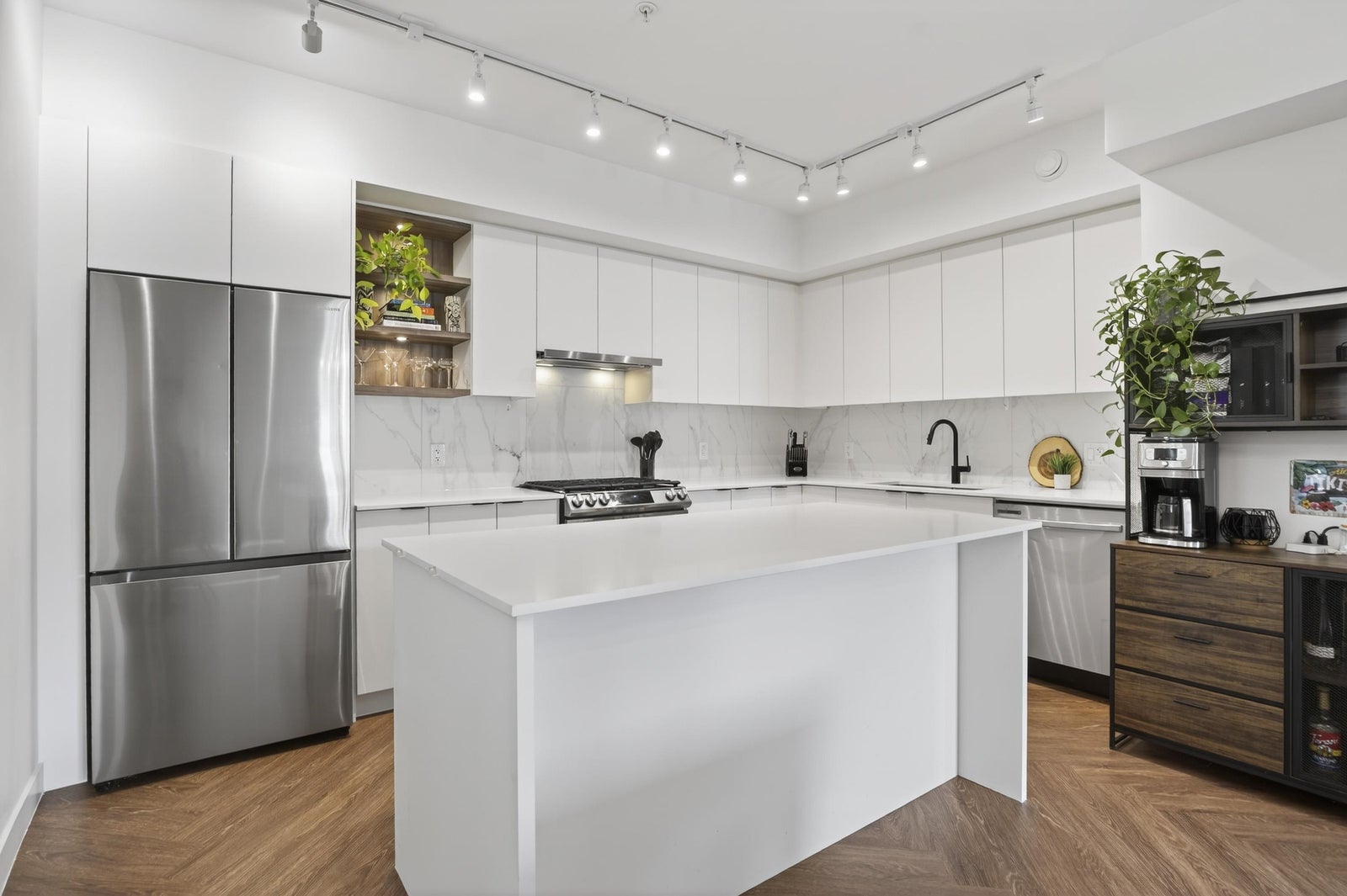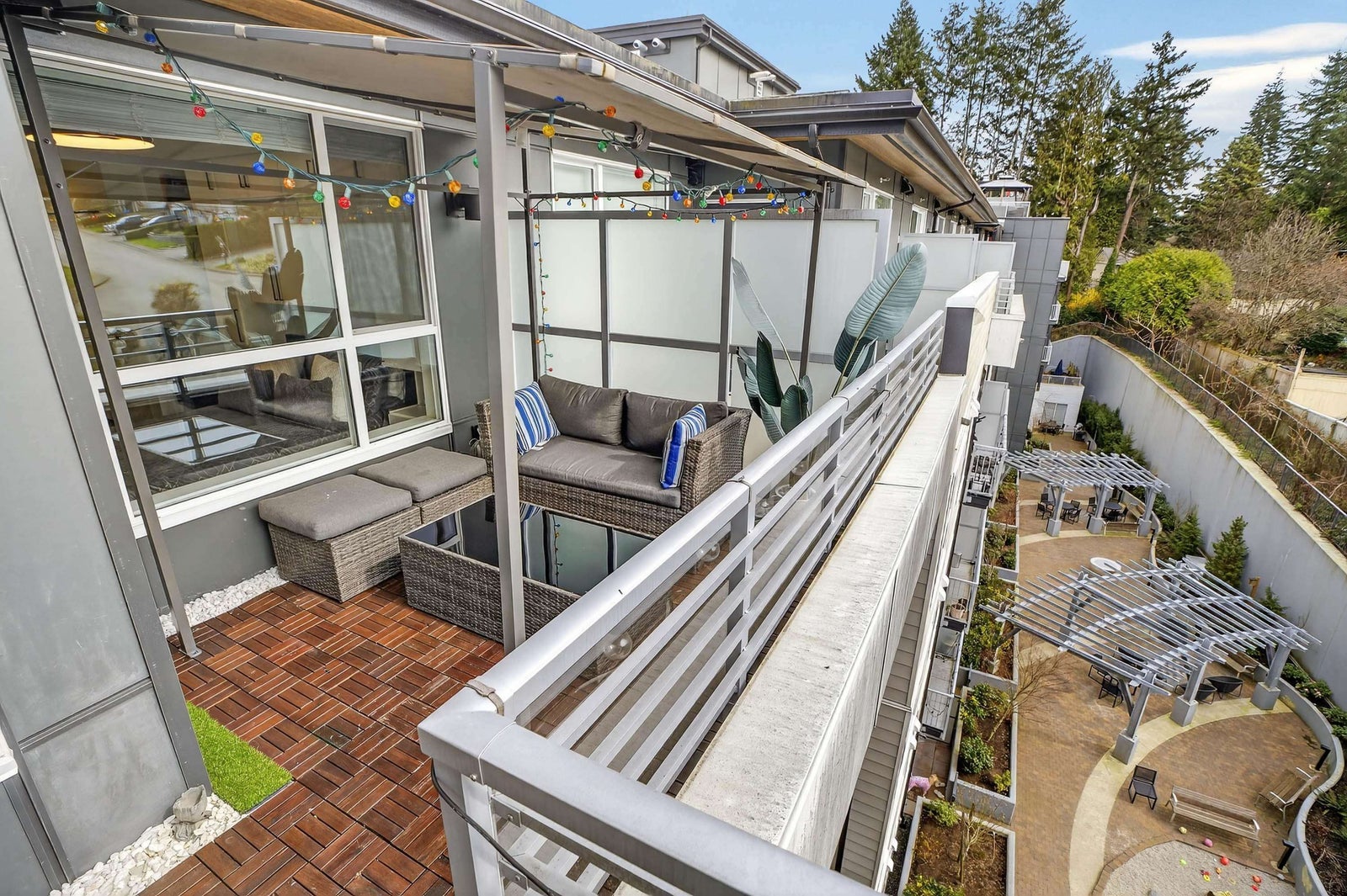 Welcome to THE CLYDE in the vibrant heart of Port Moody! This stunning penthouse has 2 bedrooms + den + 2 bathrooms, highlighted by an expansive private rooftop patio complete with a hot tub & metal gazebo—perfect for relaxing or entertaining. Offering 1,054 sq ft of open-concept living, the home showcases a sleek white kitchen with quartz countertops, a large island, S/S appliances, & vinyl herringbone flooring throughout. The spacious primary bedroom includes custom built-in cabinets & a private ensuite, while the second bedroom is bright & generously sized with plenty of natural light. Bonus features include 2 side-by-side EV-ready parking stalls, 1 storage locker & 2 pets allowed. Ideally located just steps from Inlet Skytrain & everything Port Moody offers.