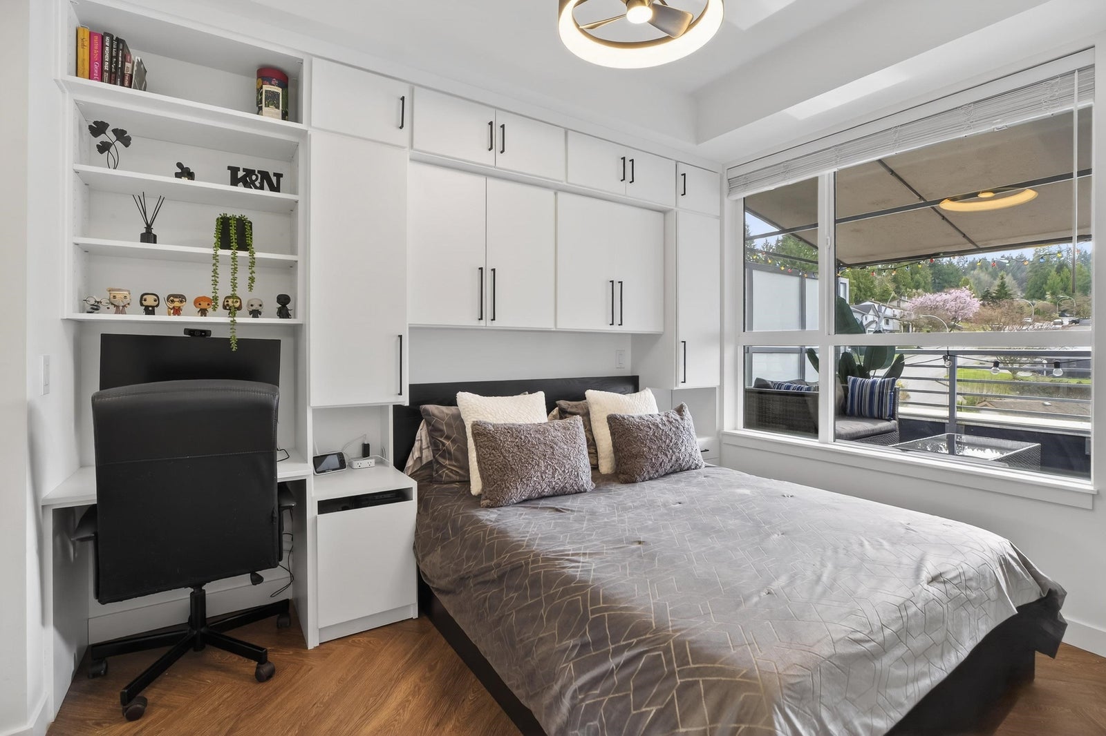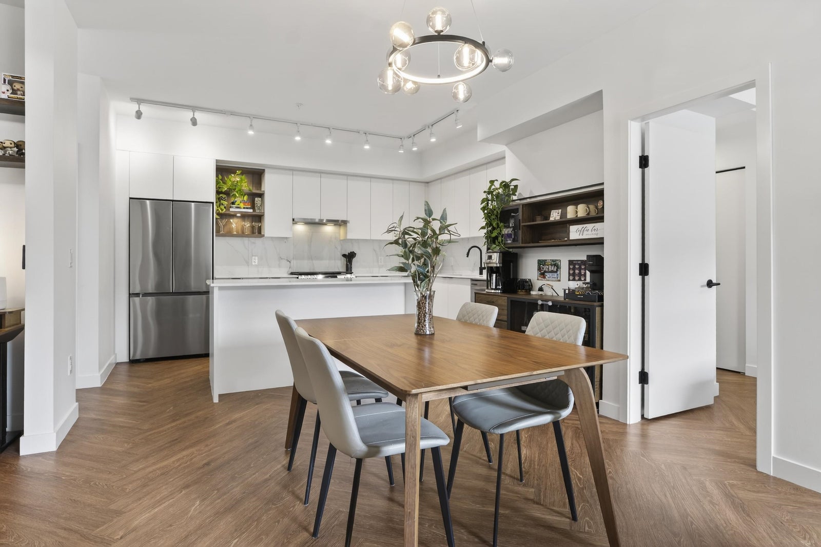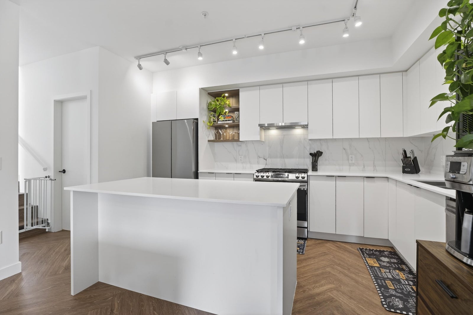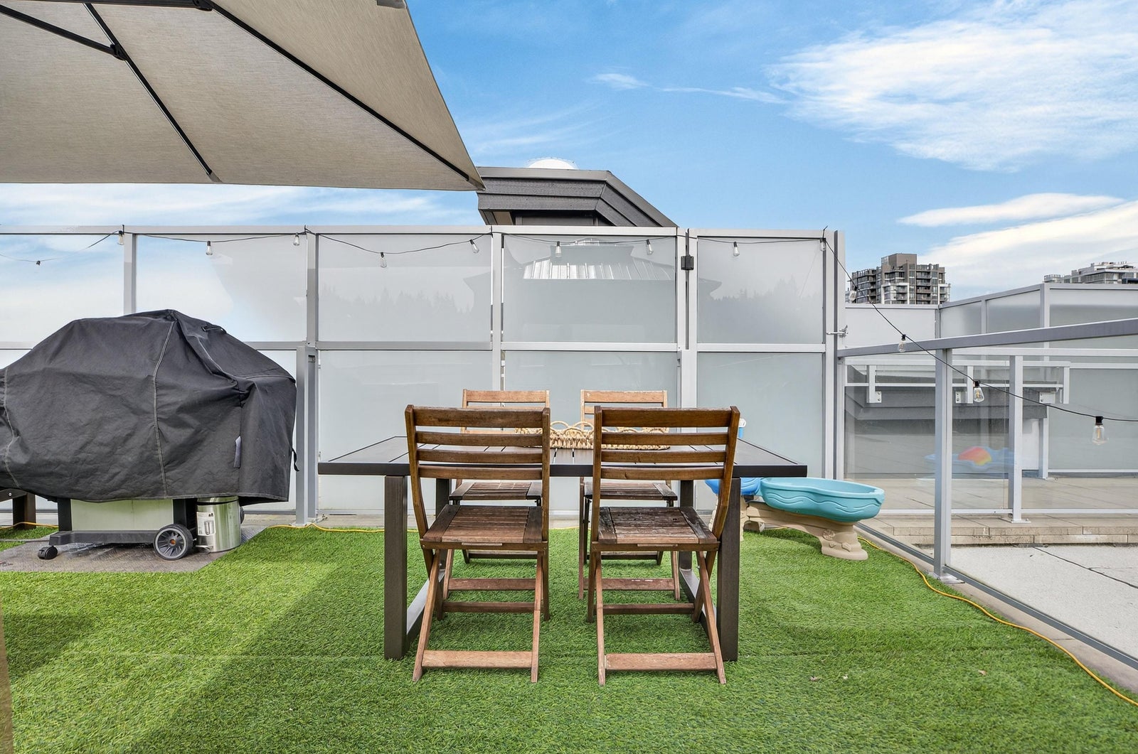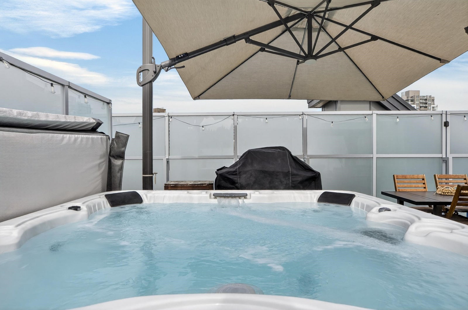 Welcome to THE CLYDE in the vibrant heart of Port Moody! This stunning penthouse has 2 bedrooms + den + 2 bathrooms, highlighted by an expansive private rooftop patio complete with a hot tub & metal gazebo—perfect for relaxing or entertaining. Offering 1,054 sq ft of open-concept living, the home showcases a sleek white kitchen with quartz countertops, a large island, S/S appliances, & vinyl herringbone flooring throughout. The spacious primary bedroom includes custom built-in cabinets & a private ensuite, while the second bedroom is bright & generously sized with plenty of natural light. Bonus features include 2 side-by-side EV-ready parking stalls, 1 storage locker & 2 pets allowed. Ideally located just steps from Inlet Skytrain & everything Port Moody offers.